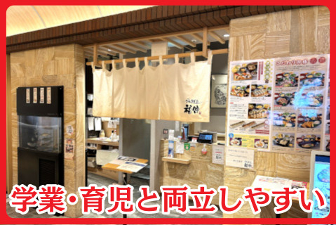 | 時間 | シフト制 9:00~22:00の間で1日4~8時間 ※週1日~5日の勤務 日数・時間は相談OK ※残業はありません □平日のみ・土日のみOK ※曜日の固定OK □朝のみ・昼のみ・夜のみOK □0日勤務の週があってもOK \学業や家庭との両立を応援/ テスト休み・就活・サークルの予定、 お子さんの急な体調不良や学校行事など 急なお休みにも対応できます |
