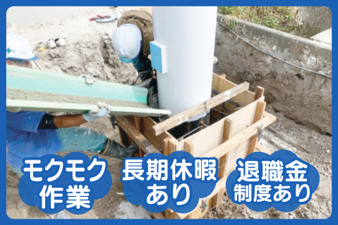 | 時間 | 変形労働時間制(1ヶ月単位) 8:30〜17:30(休憩60分) ※現場によって早出・残業の場合あり ◎月平均時間外労働時間:10時間 ◎月平均労働日数:22日 |