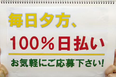 | 給与 | 昼勤/日給9,000円〜 夜勤/日給1万1,000円〜 ※うれしい完全日払い! ※早朝・残業等、各種手当別途支給! |