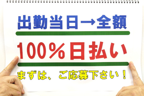 | 給与 | 日給10,000〜15,000円+諸手当 ※経験者は能力により優遇します! |